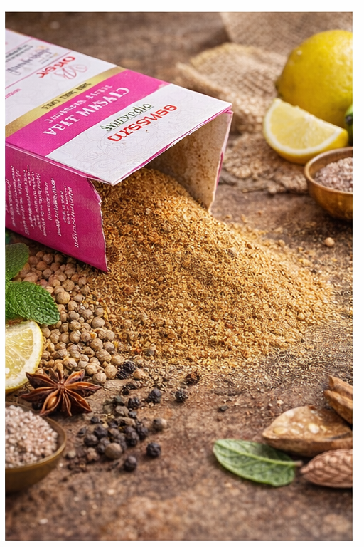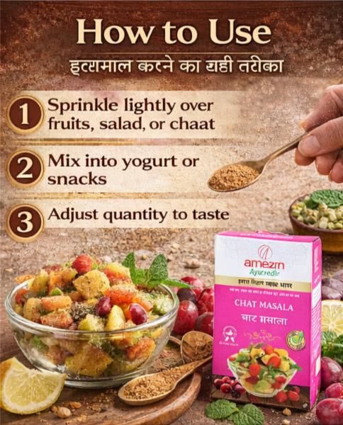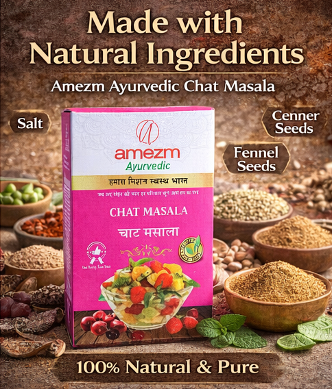 Amezm Ayurvedic Chat Masala पारंपरिक भारतीय मसालों के मिश्रण से तैयार किया गया एक विशेष मसाला है जो आपके रोज़मर्रा के भोजन को स्वादिष्ट और चटपटा बनाता है।