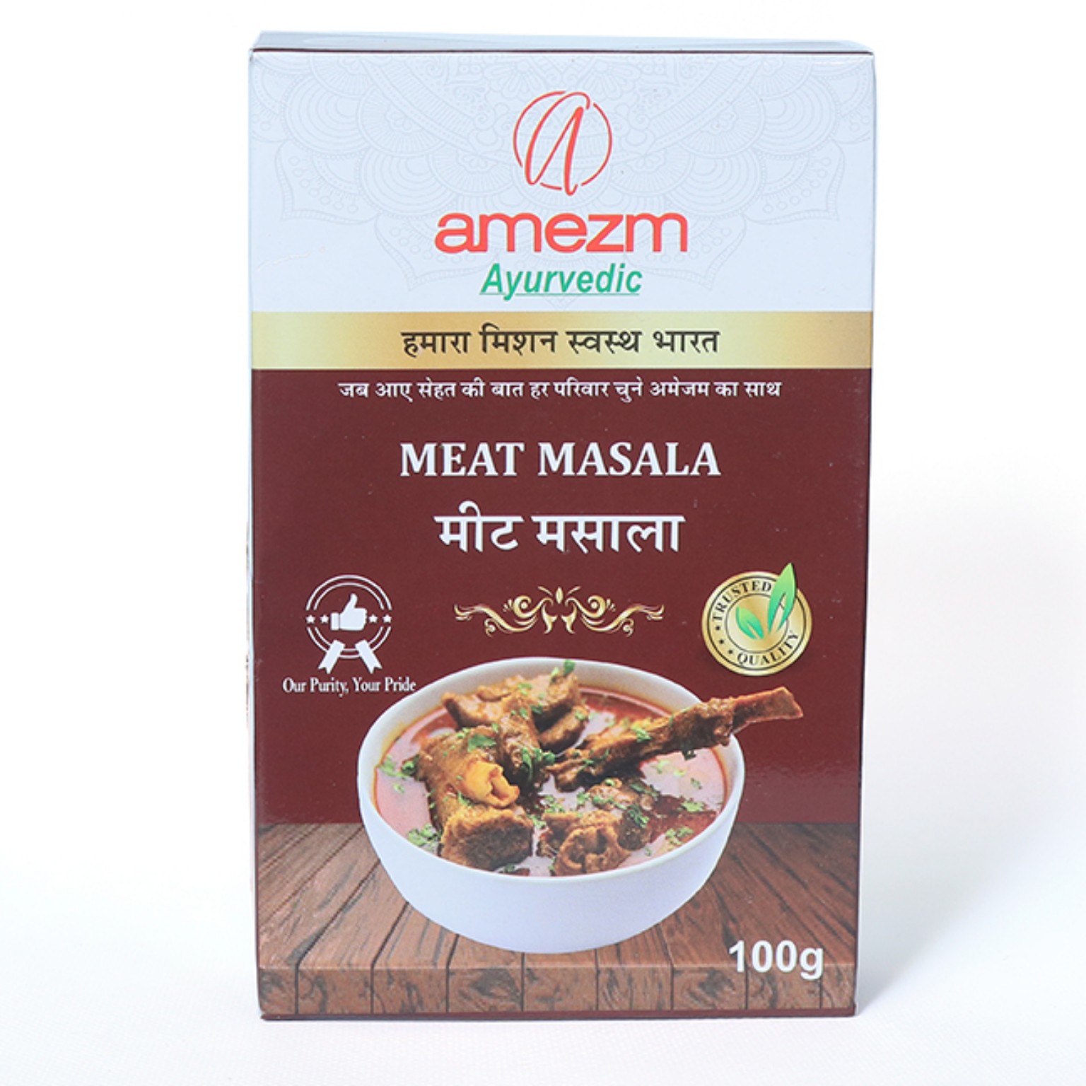 Amezm Ayurvedic Meat Masala पारंपरिक भारतीय मसालों का एक बेहतरीन मिश्रण है जिसे खासतौर पर मटन और मीट की डिशेज़ को स्वादिष्ट बनाने के लिए तैयार किया गया है।