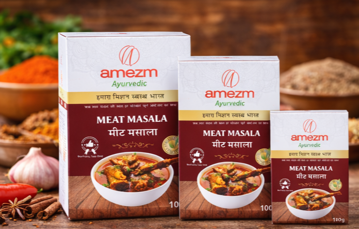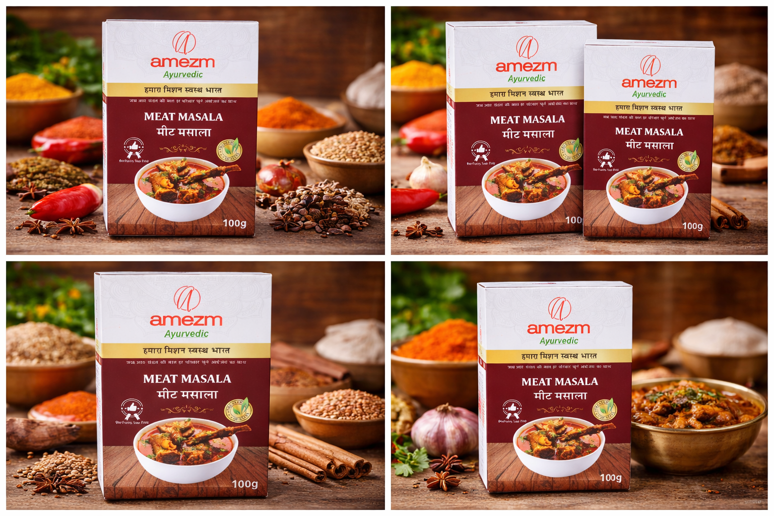 Amezm Ayurvedic Meat Masala पारंपरिक भारतीय मसालों का एक बेहतरीन मिश्रण है जिसे खासतौर पर मटन और मीट की डिशेज़ को स्वादिष्ट बनाने के लिए तैयार किया गया है।