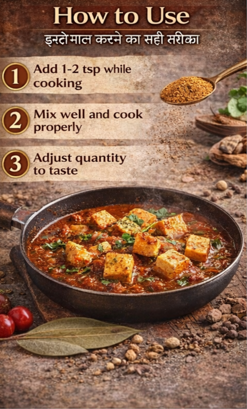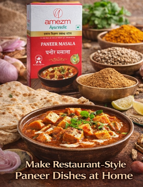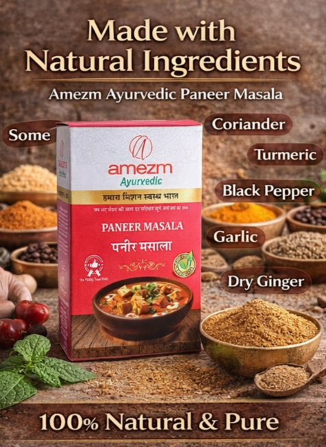 Amezm Ayurvedic Paneer Masala विशेष रूप से पनीर की विभिन्न डिशेज़ जैसे पनीर बटर मसाला, कढ़ाई पनीर और शाही पनीर के स्वाद को बढ़ाने के लिए बनाया गया है।