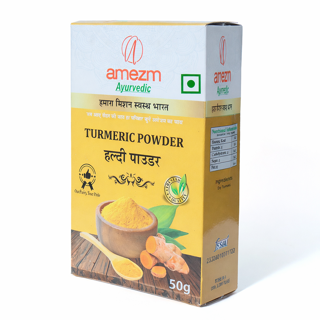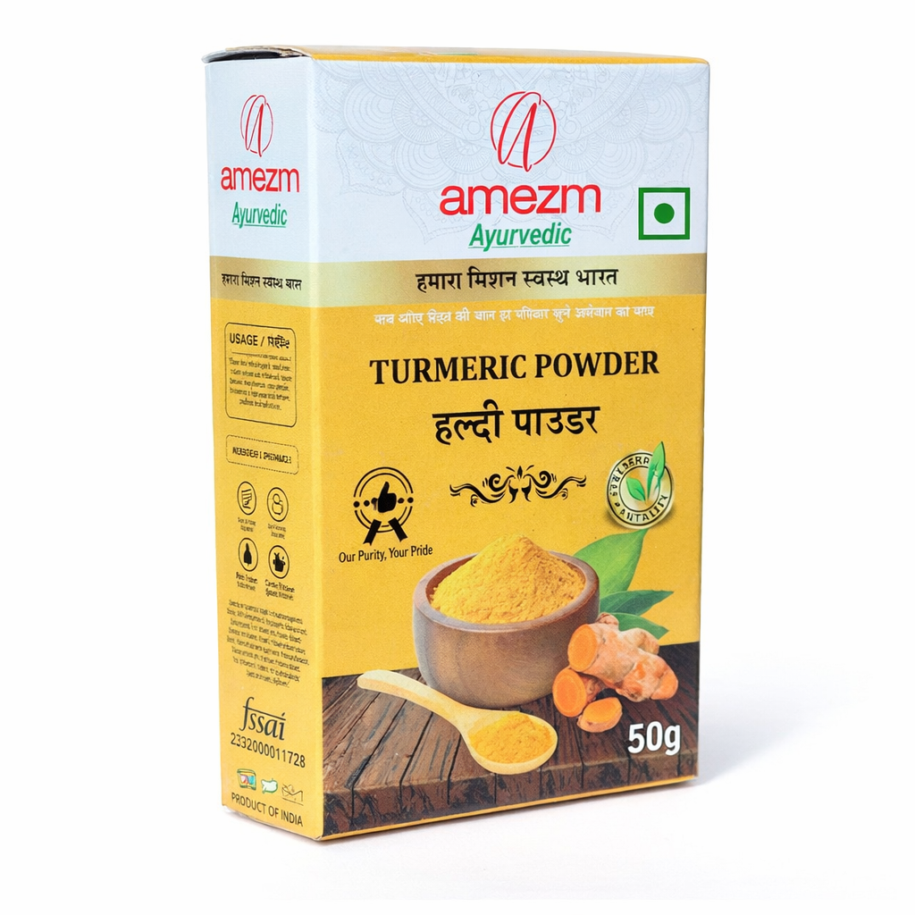 Amezm Ayurvedic Turmeric Powder is a pure and natural spice prepared from high-grade turmeric roots using traditional Ayurvedic processing methods. Known as Haldi, turmeric has been an essential part of Indian kitchens and Ayurveda for centuries.