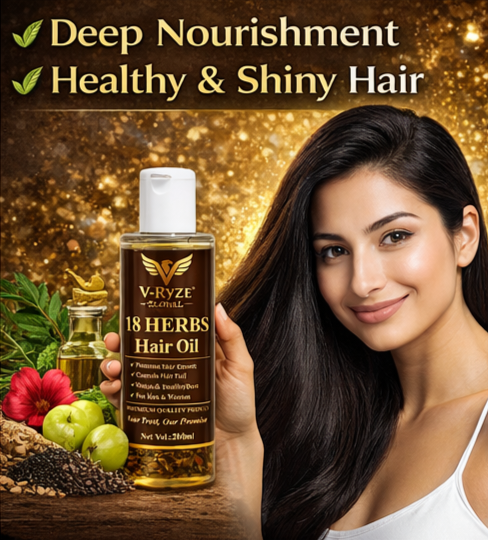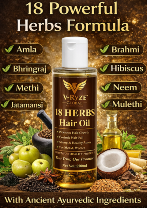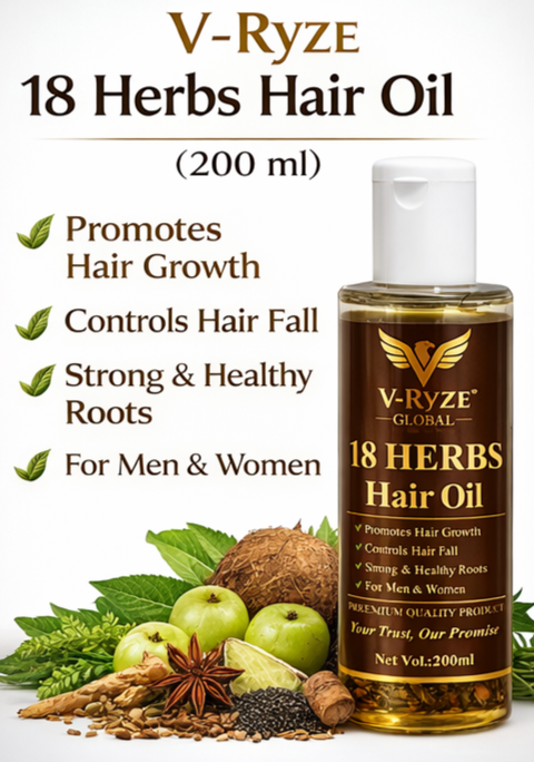 V-Ryze 18 Herbs Hair Oil प्राकृतिक जड़ी-बूटियों से तैयार किया गया एक प्रीमियम हेयर केयर ऑयल है। इसमें 18 हर्ब्स का विशेष मिश्रण है जो बालों की जड़ों को गहराई से पोषण देता है और बालों को मजबूत बनाने में मदद करता है।